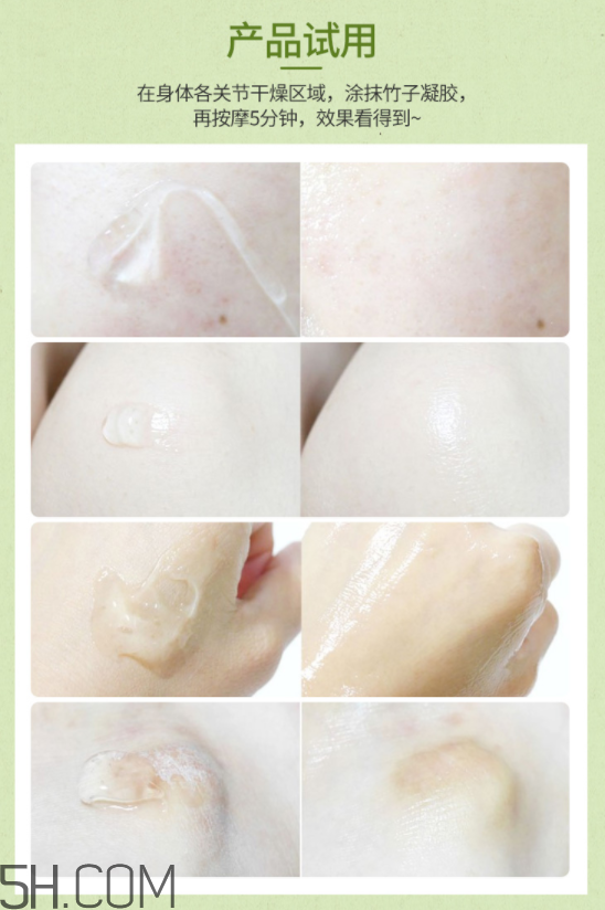 在身體各關節(jié)干燥區(qū)域,涂抹竹子凝膠,再按摩5分鐘,效果看得到。