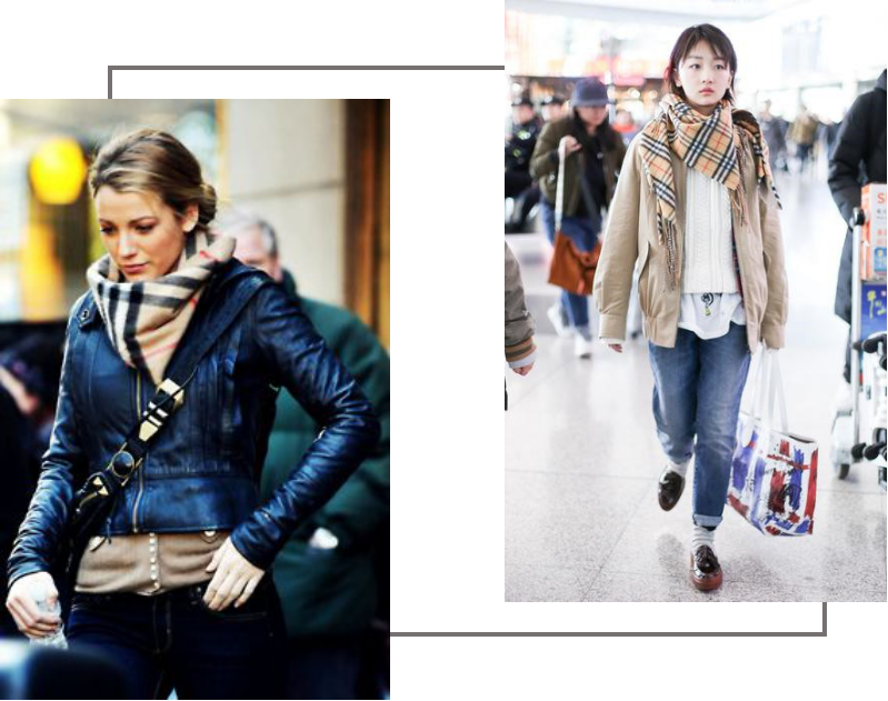 Blake Lively選擇了駝色大格紋,知性優(yōu)雅;而周冬雨則佩戴了比較適合嬌小女生的小格紋款,突出休閑率性的個(gè)人風(fēng)格。