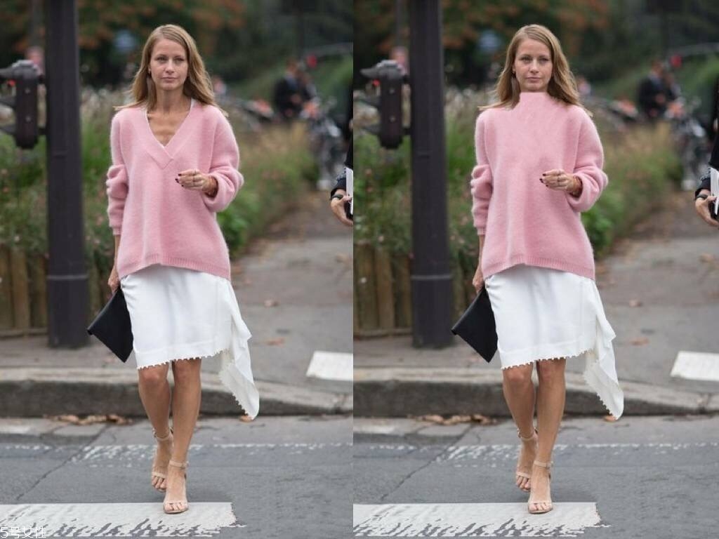 現(xiàn)在立秋,氣溫漸涼。“露”的原則仍然有效,以人人都會(huì)穿的毛衣和打底衫來(lái)說(shuō),高領(lǐng)和V領(lǐng)的顯瘦效果就高下立見(jiàn)。 淺色、有膨脹感的毛衣,“露”就是顯瘦的鐵則,而且能讓整套 look看起來(lái)“更透氣”。(5毛P圖又來(lái)了hh)