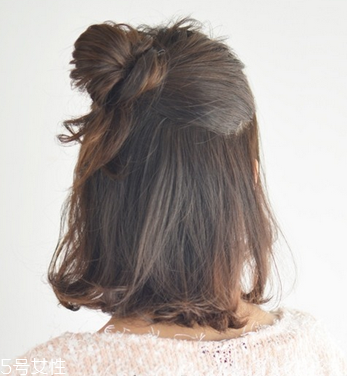 從后面看傾斜的設計更加俏皮可愛,對于短發(fā)的造型來說再適合不過了。這就是可愛的齊肩短發(fā)扎好后的造型哦,半扎發(fā)搭配上丸子頭是不是很可愛呢。