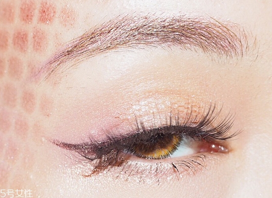 第二步:接著使用棕粉色眼影在整個(gè)眼窩打底,接著用酒紅色眼影暈染雙眼皮。