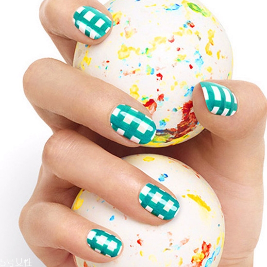 第一款格子圖案美甲,白色和綠色的搭配,形成了格子空白,特別時尚的一款美甲圖案哦,在顯白的同時還能兼顧時尚就選它了。