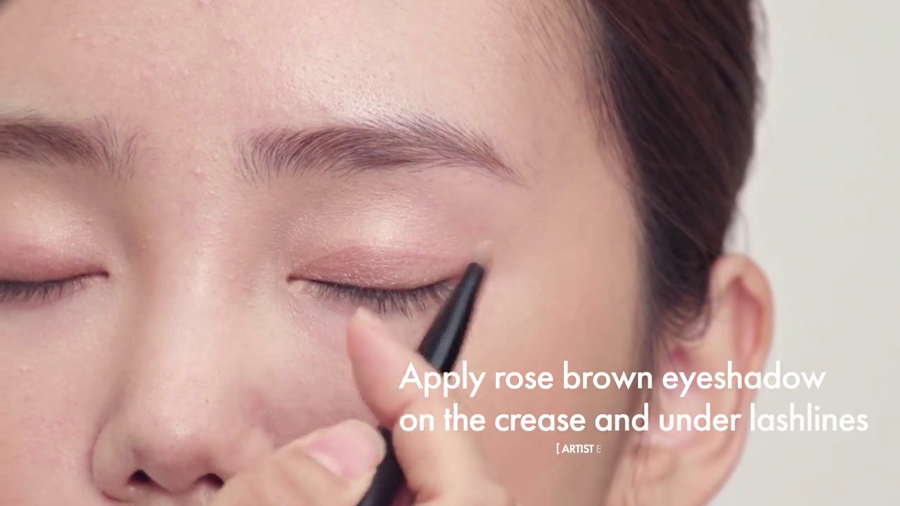 在上眼瞼個(gè)眼下位置,掃上切合自然裸妝的蜜桃色霧面眼影。