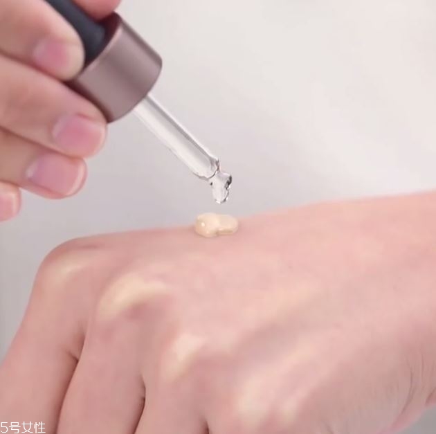 在平常用量的粉底粉上,加入1-2滴精華。再用粉底掃上妝。