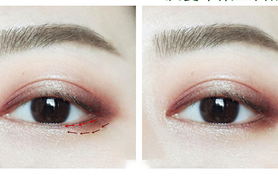 第二步:深棕色眼影貼近睫毛畫在雙眼皮內(nèi)前后各三分之一的部分,接著再沾取珠光紅色在邊緣反復(fù)暈染至自然。
