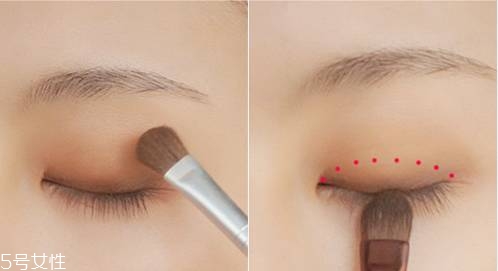 用大號(hào)眼影刷沾取粉棕色眼影作為打底平鋪在上下眼皮,怕粉色顯腫的朋友可以只涂眼頭眼尾,圖中圈出的部分留白~