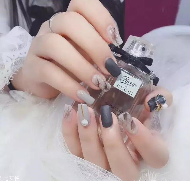 磨砂質(zhì)感的奶奶灰美甲也不錯(cuò)呢,加上跳色設(shè)計(jì),有撞色之美又時(shí)尚好看,簡(jiǎn)約之中還透出時(shí)尚感。