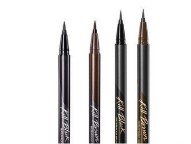 這支應該也是不少女生剛開始學化妝就用的,價格也白菜,黑色那只在眾多眼線液筆里算一般的,沒有特別出彩的地方也不會出錯。棕色那只的顏色比較好看,很正很日常。