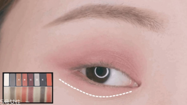 3. C 和 E 兩種顏色混合,在虛線部分制造陰影感,讓眼睛看起來不那么紅腫。用這種細(xì)頭毛多的刷子,用深棕色眼影在眼頭、眼尾加深,這個(gè)陰影的寬度不要太寬,只要保證不超過雙眼皮褶的寬度就可以了。要不然就該搶了酒紅色的風(fēng)頭了。這一步加深之后可以擴(kuò)大眼睛的長度,給眼影加深層次,這樣眼睛看起來就會不那么腫,變得更深邃一些。