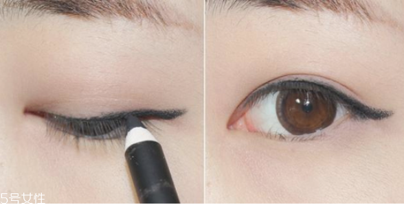 步驟6:用黑色的眼線膏沿著睫毛根部從眼頭向眼尾畫出一條細長的眼線,眼尾稍稍拉長。