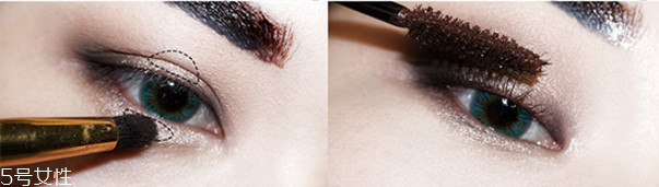 第五步:手指或者刷子沾取亮片色點(diǎn)在眼妝針對下方的臥蠶處和眼珠正對上方的雙眼皮折痕內(nèi),夾翹睫毛后刷上棕色睫毛膏。