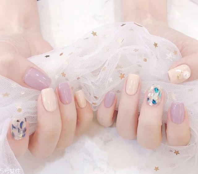 這款是淺紫和淺粉組合的美甲,淺藍(lán)與深藍(lán)的亮片組合在一起,簡(jiǎn)簡(jiǎn)單單的顏色組合在一起,很清新的顏色。