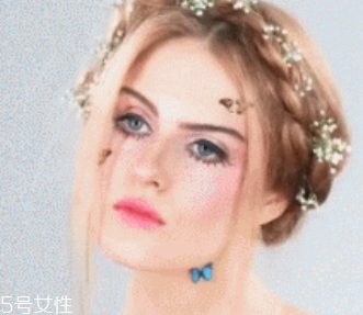 用眼線筆畫出長長的下睫毛,在眼下點出小斑點+小蝴蝶;頭發(fā)變成三股辮,再戴上美美的頭飾,像是森林泉水邊的小仙女的處女座。