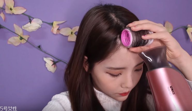 步驟一、使用發(fā)卷制造出瀏海卷度,可搭配吹風(fēng)機(jī)定型