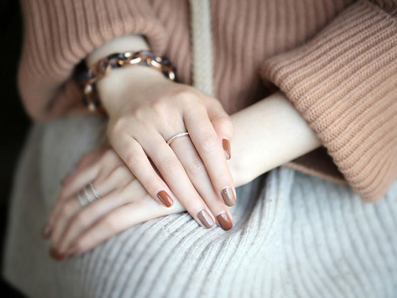 焦糖色,是今年比較火的顏色了,這個(gè)顏色的美甲,不管你是什么膚色的,做出來(lái)的效果都很好,它比駝色深,同時(shí)多了點(diǎn)紅調(diào),所以非常顯皮膚白,而且有氣場(chǎng),溫暖,是比較高級(jí)的美甲色。