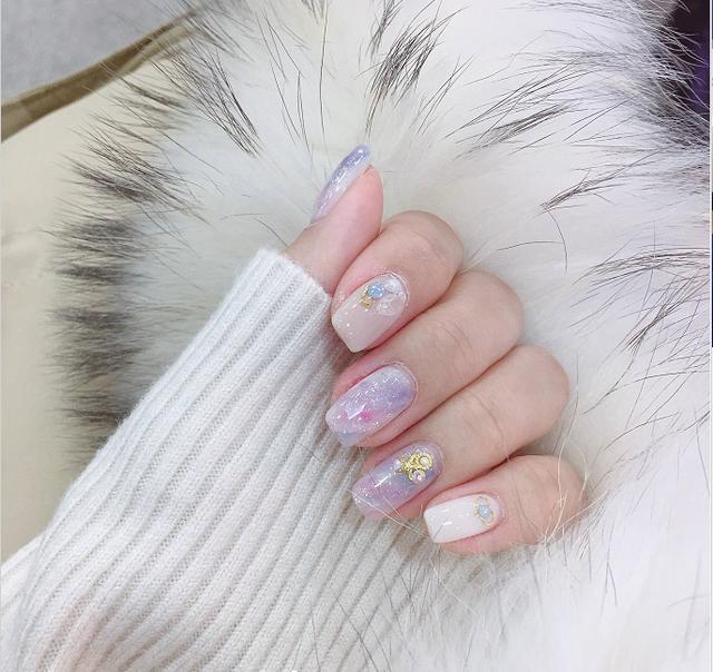 5、最后一款說說甲片吧,指甲不要輕易養(yǎng)長,要做成這種樣式才好看,紫藍混色在一起,讓神秘感那么突出,當然也多出許多浪漫感,這款作為新年款實在太合適。