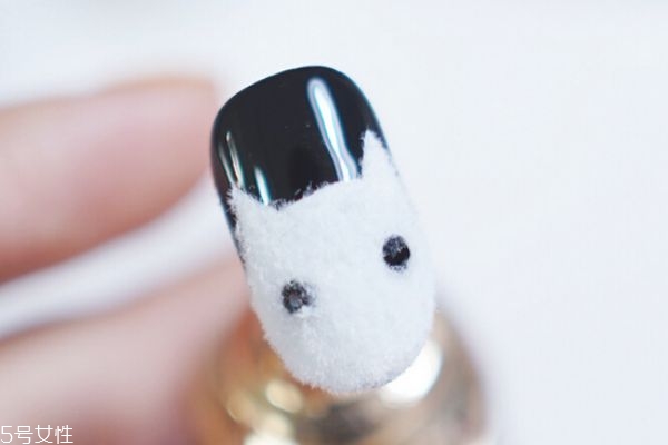 第三步:再用白色甲膠填充貓咪臉部,照燈后再刷一遍白色甲膠,照燈固化。在貓咪眼睛的位置刷上飾品膠,黏上黑色鉆飾,如圖,照燈固化。