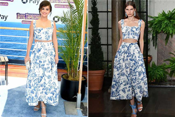 今年這種印花更是大勢流行,美國IG小天后Selena Gomez這一襲Oscar de la Renta今年春夏的兩截式洋裝,恰好露出腰間最瘦的一小截,加上白底藍花配色,讓賽妹看起來格外神清氣爽。