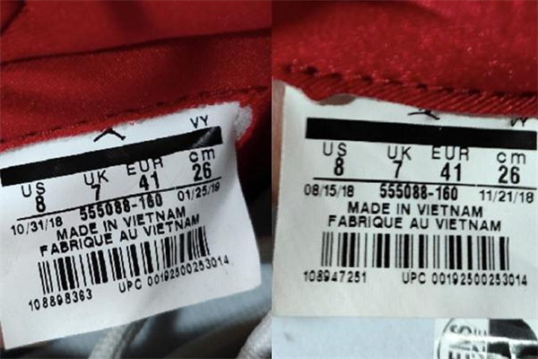 右邊這雙fake是真標(biāo)過檢版本,仿冒的級別還是很高的,外觀上小編幾乎上看不出真假的,無論是配色和細(xì)節(jié)的處理都是很不錯的。