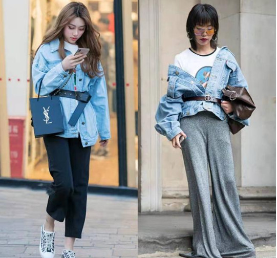 七、牛仔外套 闊腿褲:闊腿褲是去年開(kāi)始大火的單品,目測(cè)今年依然流行,搭配短款牛仔外套,顯瘦又顯高!小個(gè)子的女生記得要選擇能拉高腰線(xiàn)的穿法,高腰的闊腿褲既能遮住不好看的腿形,又能突出腰線(xiàn),搭配簡(jiǎn)單的白T和牛仔外套,加上一個(gè)丸子頭,隨性又可愛(ài)。