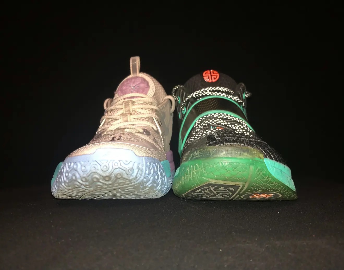 對比我手邊現(xiàn)有的兩雙同樣防側翻性能變態(tài)的球鞋,可以看到全城9的前掌內側中外底內收的弧度更大。不知道大家穿著米切爾1和韋德之道6的時候有沒有那種板腳的感受,就是感覺前掌被寬大的外底限制住,不夠靈活,那在全城9身上,這種情況基本不存在。