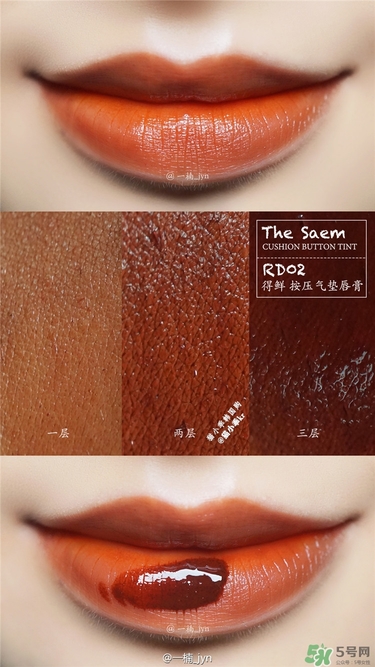 the saem得鮮按壓式氣墊唇彩rd02 是新色哦。當(dāng)時被試色種草,然后就下單了,非常好看,顯白。但我上嘴偏紅,而且容易手抖按出來很多