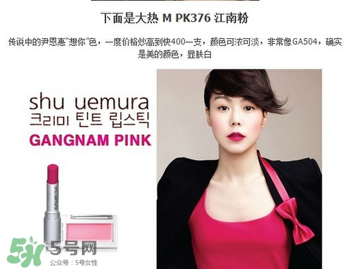 韓劇<想你>的熱播,大家都很喜歡尹恩惠用的唇膏!火到植村秀江南粉唇膏PK376,全亞洲斷貨,都要預訂。之前網(wǎng)傳尹恩惠用的是NARS的,其實不是。尹恩惠自己在訪談里特意說明了口紅的顏色和品牌,是:植村秀SHU UEMURA - ROUGE UNLIMITED SUPREME MATTE LIPSTICK # pk376 ,其它牌子都只是接近顏色,并不是原色喔!