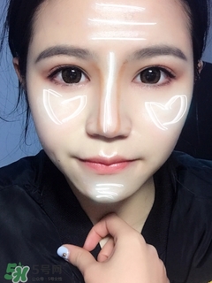 鼻梁提亮位置如圖,可以一條線筆直畫下來,也可以如上圖兩個位置提亮。這部分因人而異,自行選擇或嘗試哪種在自己臉上比較自然。圖1的位置是山根不挺的妹子一定要畫的。