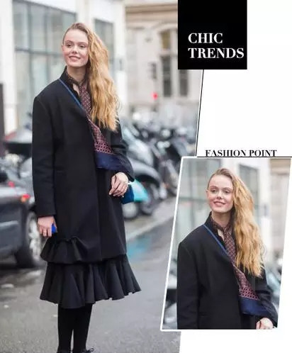 黑色大衣是必不可少的,搭配不規(guī)則擺裙,,最好鞋子也是黑色,整體比較單調(diào)沉重!然后配上波點絲巾包你chic到爆!