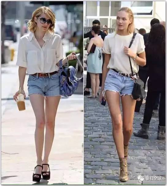 夏日最簡約的便是牛仔短褲+白色上衣。左是身高155的街拍達人Emma Roberts,右是身高176的維密天使candice swanepoel。上寬下窄的搭配風格,不站在一起的話,兩個人根本沒差。短褲真是小個子的顯腿利器。