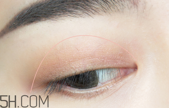 第二步:選擇桃粉色眼影用扁平刷沾取,鋪在雙眼皮褶皺處,注意這一步的范圍不要超過(guò)上一步哦,刷子上的余粉掃過(guò)下眼皮,如果你是腫眼皮的話記得要縮小范圍哦。