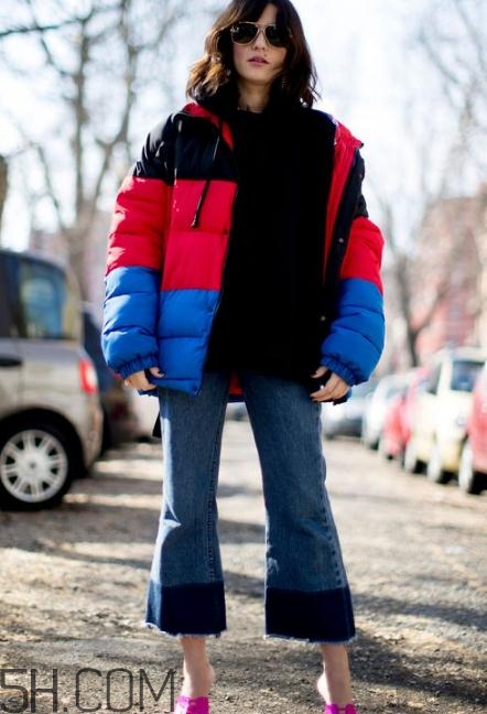 這類色塊拼接的羽絨服搭配闊腿褲來穿也是不錯的選擇,撞色組合打造強烈的視覺沖擊感,闊腿褲的加入瞬間提升氣場。