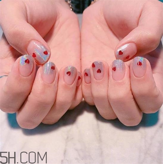 小愛心的韓系美甲也非常的好看,透明色打底就上一些銀色的點(diǎn)綴,非常的有夢(mèng)幻感。