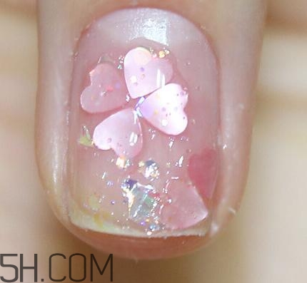 美甲之前,大家需要購(gòu)買像上圖這樣的愛心貝殼材料,還有一些銀色的小珠子,美甲需要用到的。指甲油就準(zhǔn)備粉色帶閃指甲油,透明帶亮片指甲油就可以了。