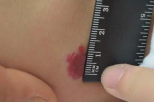 血管瘤多數(shù)發(fā)生于皮膚和皮下組織。增殖期血管瘤最初表現(xiàn)為蒼白色斑,隨后出現(xiàn)毛細(xì)血管擴(kuò)張,其周邊繞以暈狀發(fā)白區(qū)。嬰幼兒血管瘤快速增長(zhǎng)期在生后4-6周和4-5個(gè)月。較表淺的血管瘤常表現(xiàn)為凸起皮膚的鮮紅色丘疹、斑塊或結(jié)節(jié)狀病損。嚴(yán)重時(shí)病變觸疼、潰破出血。皮下深層血管瘤常為膚色的凸起結(jié)節(jié),表面時(shí)有泛藍(lán)或青紫色,伴中央毛細(xì)血管擴(kuò)張斑片。消退期通常在生后12到18個(gè)月。瘤體生長(zhǎng)速度減慢,病變質(zhì)地變軟。消退期血管瘤的瘤體色澤從鮮紅色轉(zhuǎn)變?yōu)榘导t或紫羅蘭紅,進(jìn)而變?yōu)榛疑?,變色從病變中心開(kāi)始。瘤體逐漸縮小消退。
