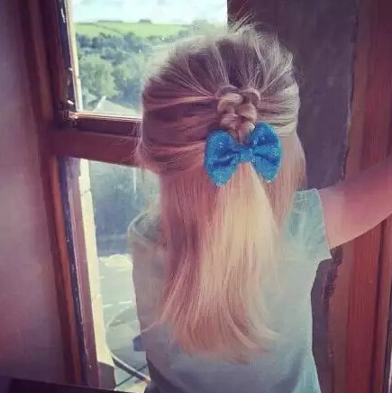 第六步:在兩條發(fā)辮的交匯處點綴一個精致的小花配飾,獨特字母造型的綁發(fā)方法看似復(fù)雜其實做起來非常簡單,媽媽們學(xué)會了嗎?