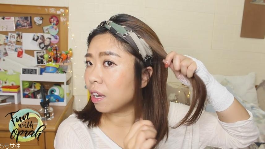 4. 抓發(fā)帶外的一束頭發(fā),與發(fā)帶內(nèi)的發(fā)絲一同卷起