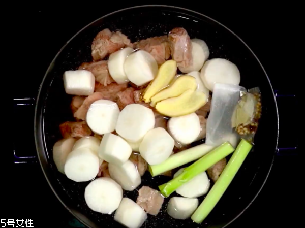 3. 備一鍋冷水下牛腩塊、香料包、蒜白、米酒、姜片大火煮滾后,轉(zhuǎn)小火慢燉1小時