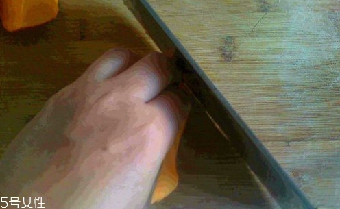 3.南瓜的肉很實(shí),用刀切要用勁。右手握刀把垂直放在小塊南瓜上,