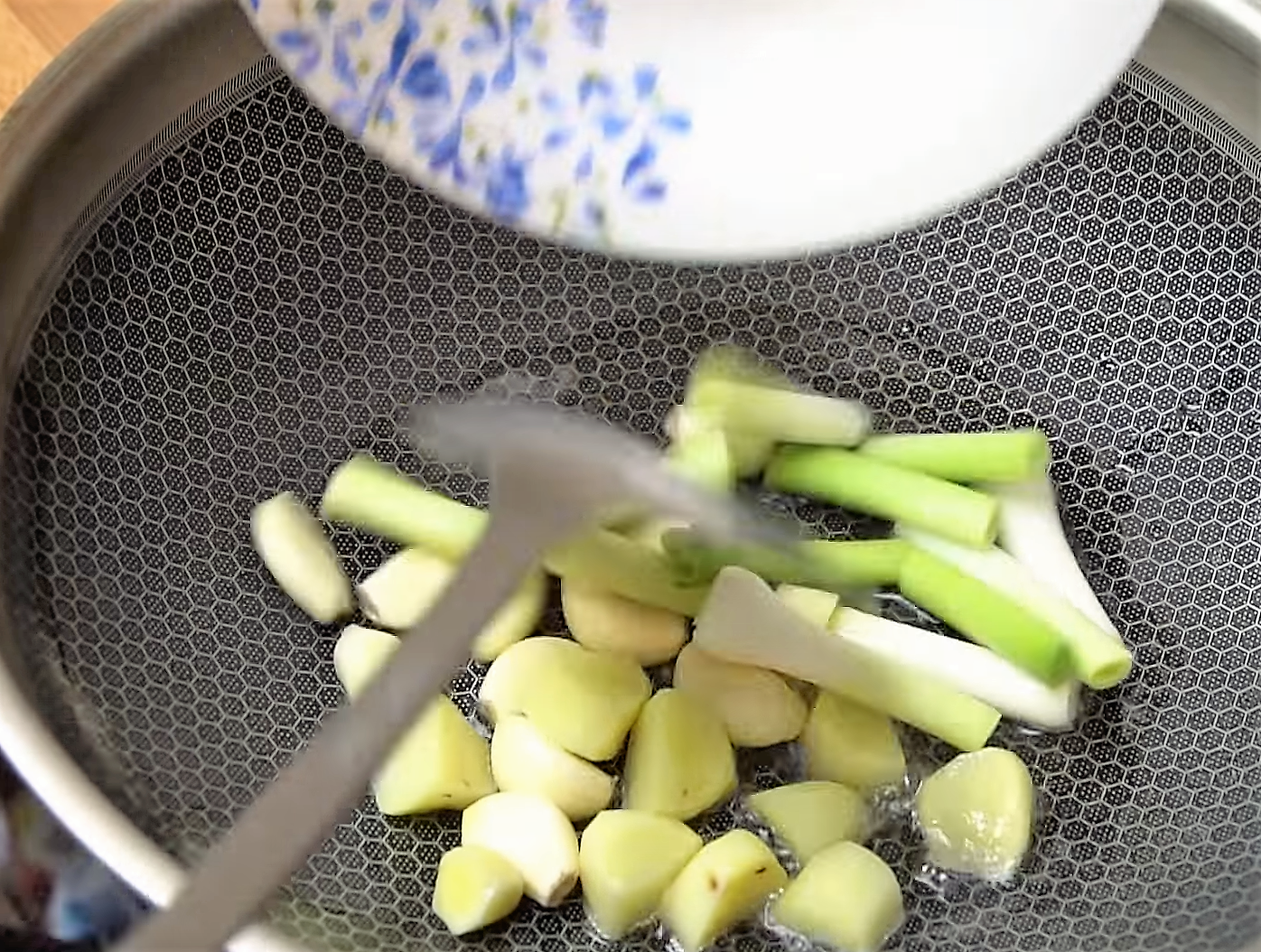 3.鍋里加入3大匙食用油,加入蒜梗、姜塊和蒜瓣,中火炒香。