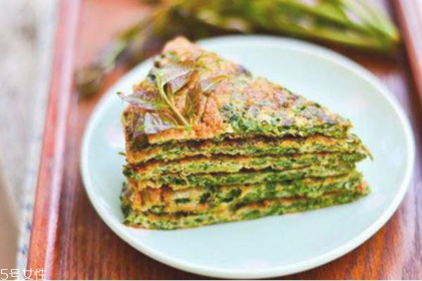 04.平底鍋加油,油溫6成熱時將香椿雞蛋糊倒入鍋中攤制,兩面均攤制成熟后即可食用