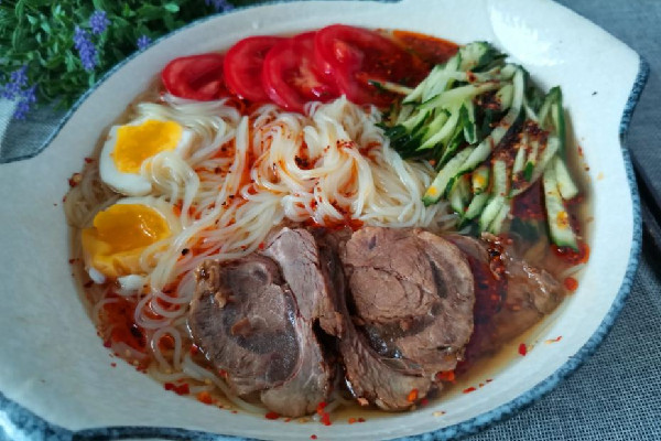 冷面是朝鮮族的傳統(tǒng)食品,是用蕎麥面或小麥面(也有用玉米面、高粱米面、榆樹皮面的)加淀粉加水拌勻,壓成圓面條,煮熟后浸以冷水,再去冷水伴牛肉片、辣椒、泡菜、梨或蘋果片、醬醋、香油等佐料,加入牛肉湯即成。以前漢族人看到壓制冷面的器具是木合子,便稱為“盒勒面”。過(guò)去,朝鮮族有正月初四中午,或過(guò)生日時(shí)吃冷面的傳統(tǒng),據(jù)民間傳說(shuō),這一天吃了纖細(xì)綿長(zhǎng)的冷面,就會(huì)預(yù)兆多福多壽、長(zhǎng)命百歲,故冷面又名“長(zhǎng)壽面”。