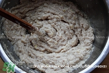 8、拌好的魚茸給少許淀粉攪拌均勻就行。