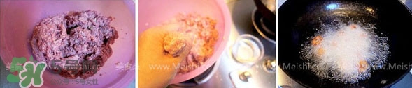 8.鍋邊放上一碗清水,將手沾濕,(這樣擠出的丸子比較光滑)左手抓上一把肉餡,將肉餡從食指與拇指之間擠出一個圓圓的丸子,用右手大拇指刮起肉丸放入油鍋中