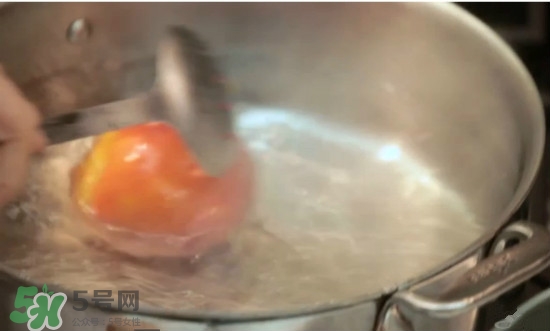 2、再把桃子放進開水中煮,并不斷的翻動,直到切口處桃皮有脫皮的跡象,一般1分鐘時間就會開口。