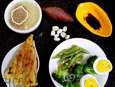 蔥花餅+煮雞蛋+小米粥+亞麻籽粉+烤紅薯+涼拌豆角+開心果+水焯西蘭花